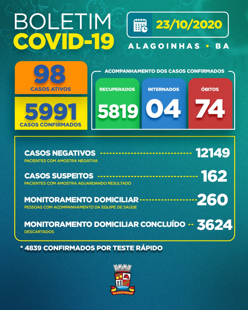 No que se refere ao número de óbitos, após análise e investigação dos dados recebidos do Governo do Estado neste mês de outubro, a Secretaria Municipal de Saúde (SESAU) informa que, até o momento, foi confirmado que mais 9 pessoas que morreram vítimas de Covid-19 eram residentes de Alagoinhas, contabilizando 74 óbitos registrados, no município.